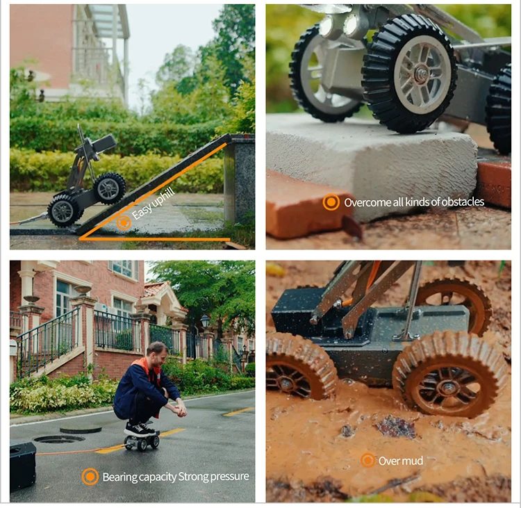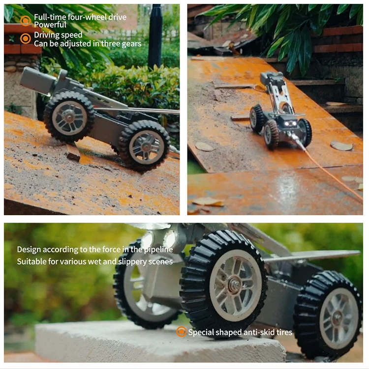 T his is a high-definition pipeline robot, it can adapt to the diameter of 300mm-1500mm, with bright lighting, with high-strength climbing ability, the maximum climbing ability is not less than 30 degrees. In-pipe robot body forward, backward, left and right turn when the body attitude real-time animation, the body bracket can be manually adjusted to meet the needs of different pipe diameter. Standard with 60 meters thick wear-resistant cable, you can screenshot, video, superimposed display date and time, construction information, cable length and other information. The IP68 crawler is waterproof, and the special-shaped anti-skid tire can be designed according to the forces in the pipeline to adapt to all kinds of wet and slippery scenes