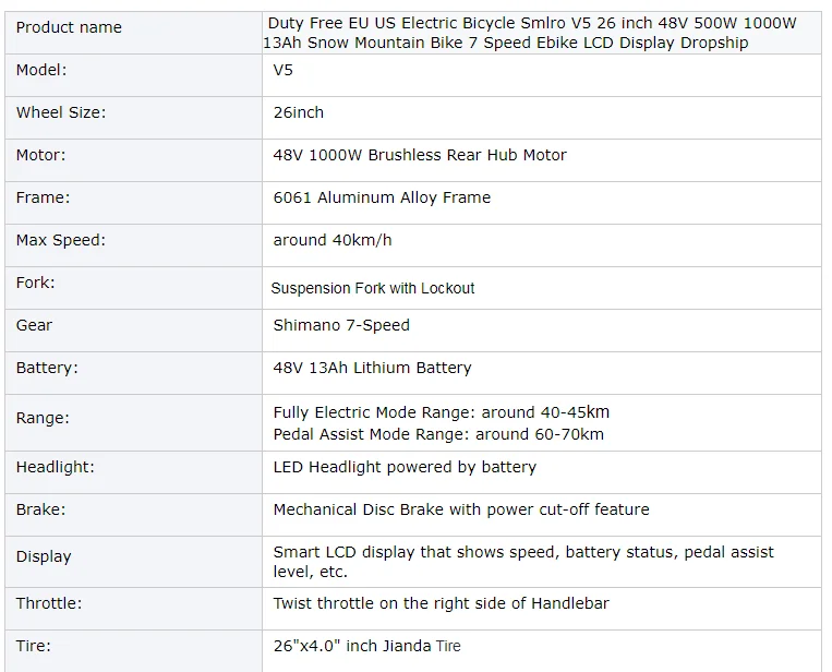 Duty Free SMLRO V5 EU US Electric Bicycle 26 Inch 7 Speed 48V 500W 1000W 13Ah Snow Mountain Bike LCD Display