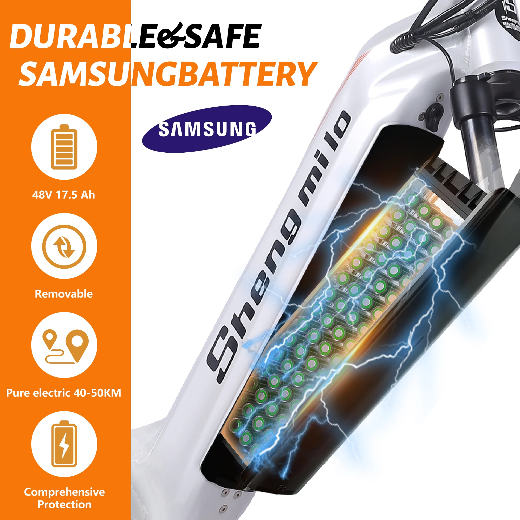 The Shengmilo MX06 26 Inches Mountain Electric Bike features a lightweight coated aluminum frame that combines comfort with classic style. Equipped with a powerful 48V 17.5Ah Samsung battery that can provide up to 30-40 kilometers of charging, and a world-leading Bafang 500W motor that can provide up to 1000W peak power when climbing hills for maximum power, I think it will be the best in the market favorite.