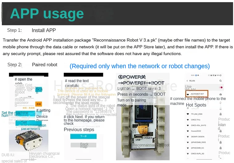 1. This robot can be remotely controlled by Android phone and remote controller, and both have real-time images.