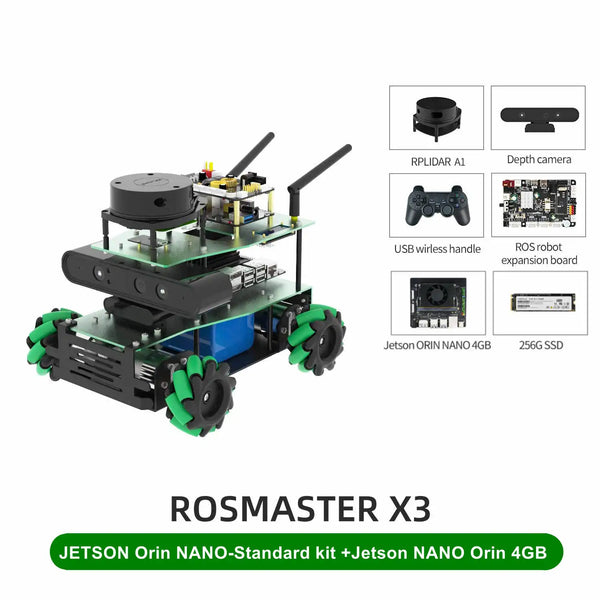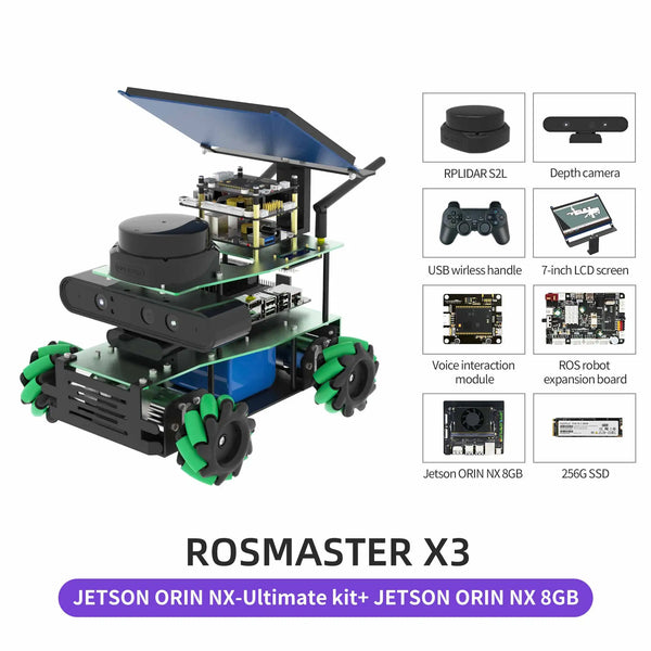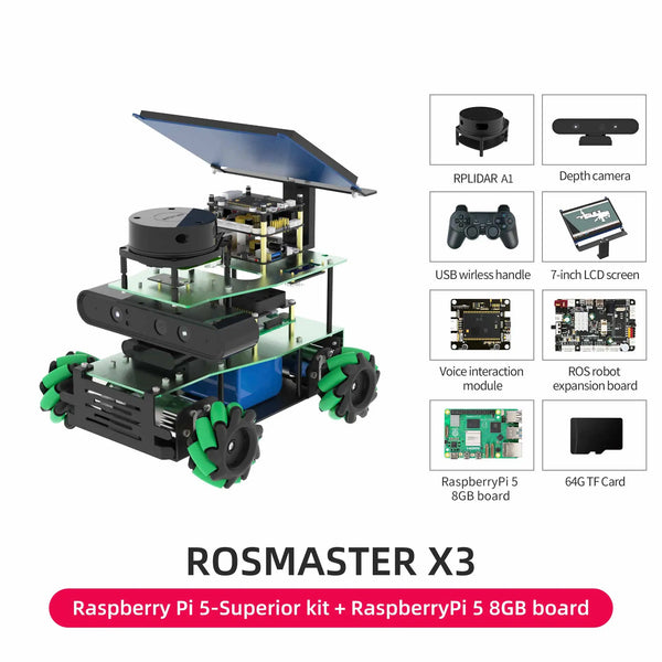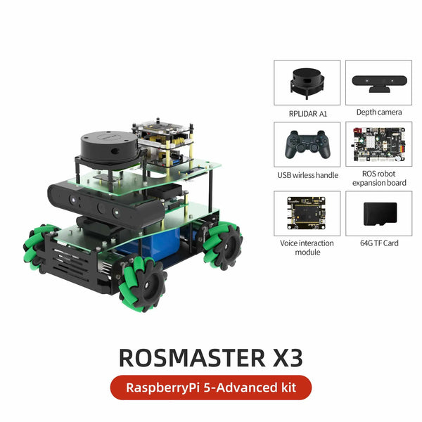 ROSMASTER X3 is an educational robot based on the robot operating system with Mecanum Wheel, compatible with Jetson NANO/Xavier NX/TX2 NX and Raspberry Pi 5. It is equipped with lidar, depth camera, voice interaction module and other high-performance hardware modules. Using Python programming, ROSMASTER X3 can realize mapping and navigation, following or avoiding, Autopilot and human body posture detection. It support APP remote control, APP mapping navigation, handle remote control, ROS system PC control and other cross-platform remote control methods. We provide many video courses and a large number of codes, which can allow users to learn artificial intelligence programming and ROS systems.
