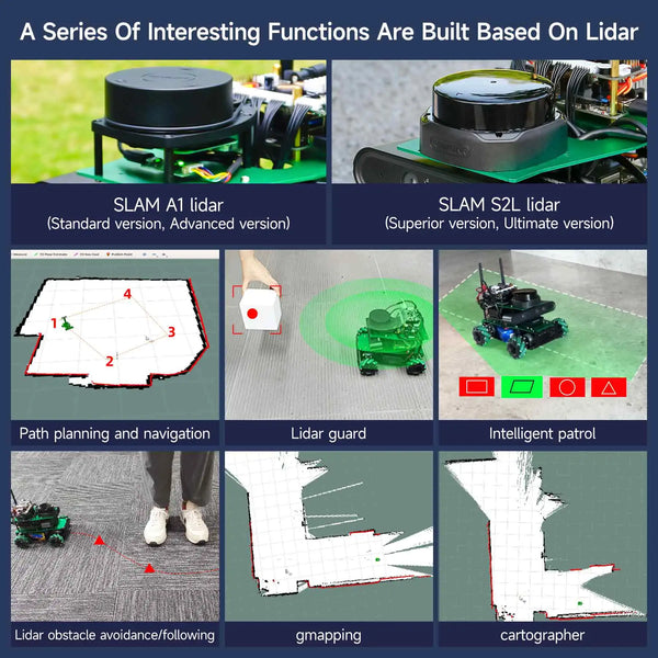 Professional hardware configuration, lidar, depth camera, voice interaction module, etcFour controllers are available, Jetson NANO, Jeston ORIN NANO, Jeston ORIN NX and Raspberry Pi 5.