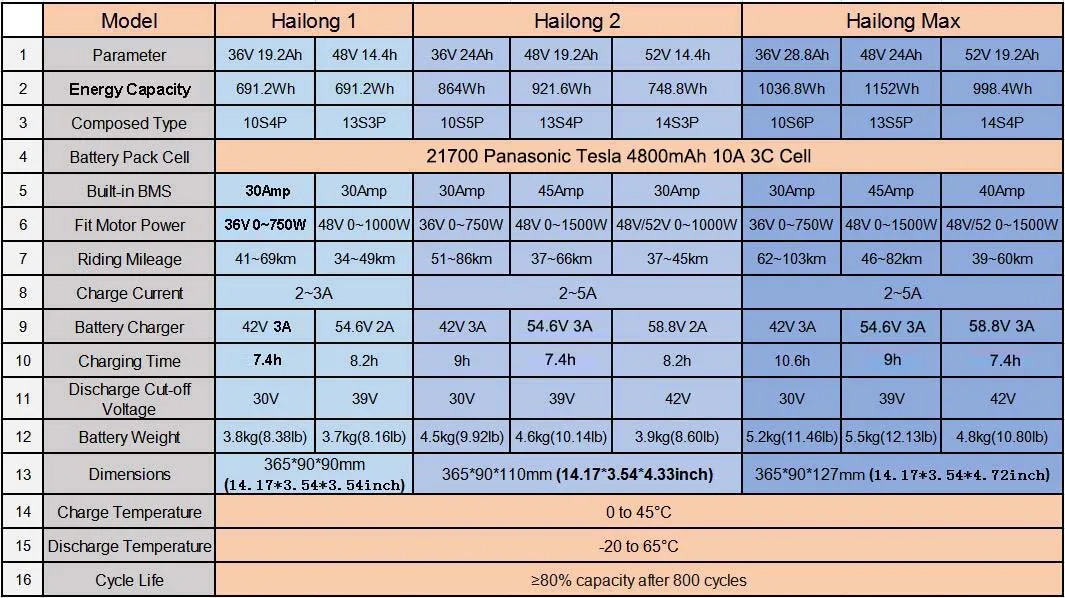 21700 Hailong Ebike Battery Specifications