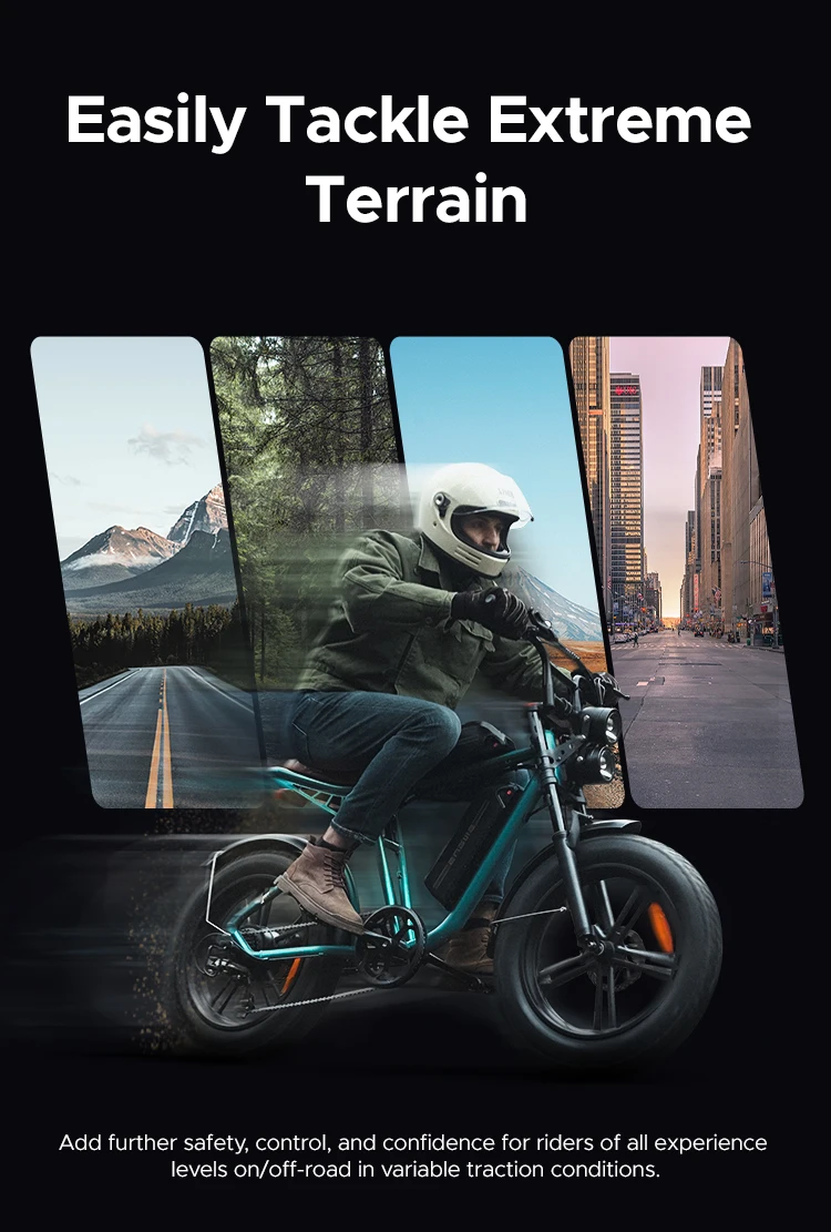 Equipped with a full shock absorption system, the Engwe M20 offers a smooth and comfortable ride. From the front hydraulic shock to the rear air shock, the dual suspension system minimizes the feeling of bumps, allowing you to tackle extreme terrain with confidence. The 20x4.0-inch rubber mountain fat tires provide excellent traction and stability, ensuring optimal performance on various surfaces.